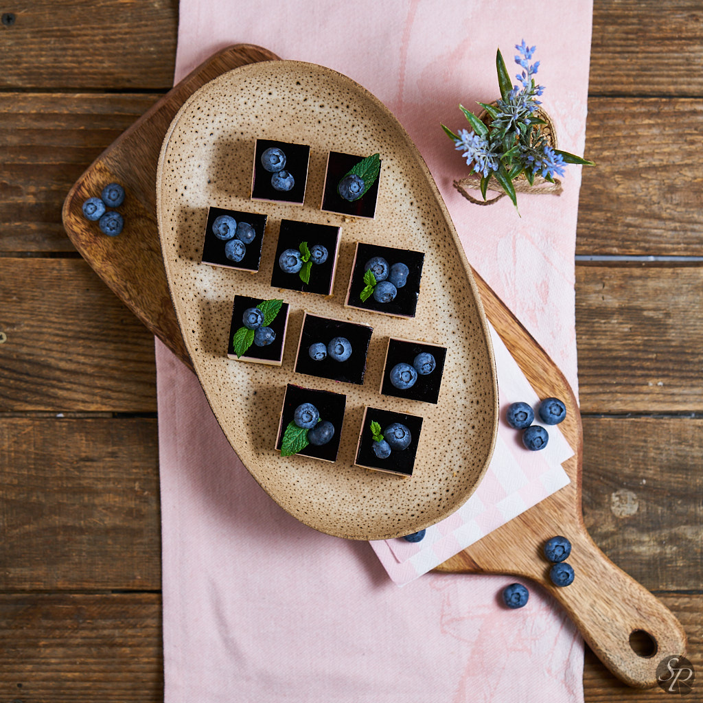 Avgustovske objave pričenjam z receptom za preproste borovničeve rezine in TO brez peke.  Rezine so sestavljene iz piškotnega dna, kreme iz maskarpone sira in jogurta z okusom vanilije ter preliva iz zamrznjenih borovnic.