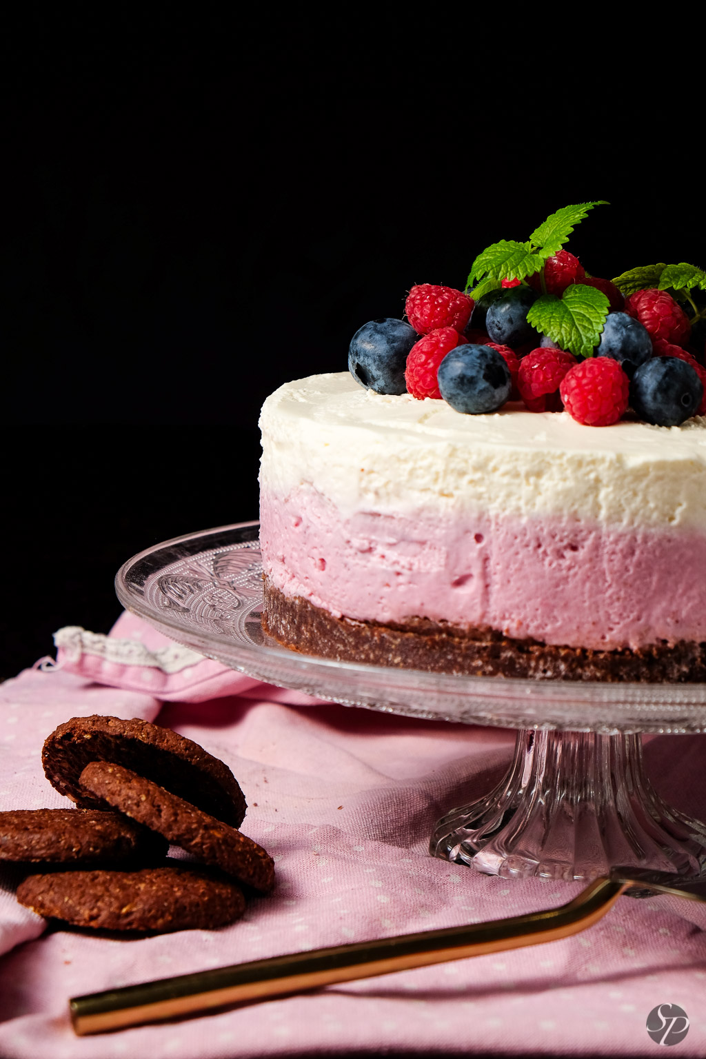 Najprej se lotimo priprave piškotne podlage. Maslo stopimo na zmerni temperaturi. Polnozrnate čokoladne piškote zdrobimo. To naredimo v multipraktiku ali jih damo v vrečko in jih zdrobimo z valjarjem. Zdrobljenim piškotom dodamo stopljeno maslo. Tortni model premera 18cm premažemo s sončničnim oljem (ne z maslom) ter obložimo s peki papirjem. Piškotno testo usujemo v tortni model, ga enakomerno porazdelimo po pekaču in shranimo v hladilnik za dobre pol ure. V tem času, ko se naše dno hladi se lotimo priprave kreme.