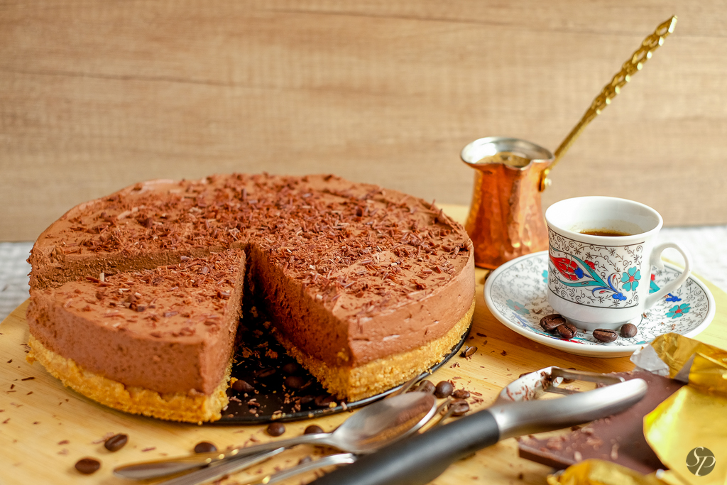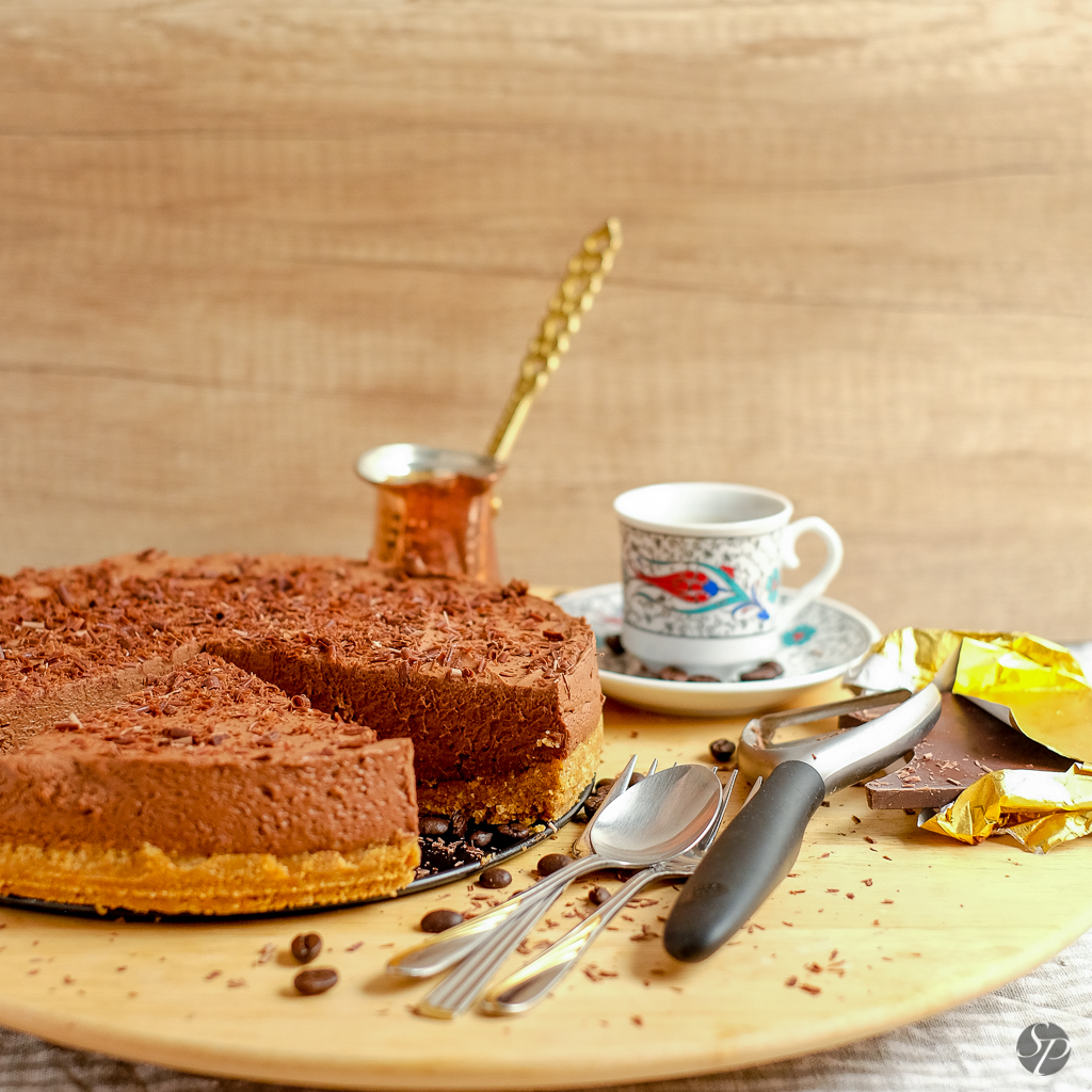 Vreme čez vikend je bilo kot nalašč za poležavanje pred TV-jem. Gledanja filmov in mojih najljubših nadaljevank si ne predstavljam brez prekomernega uživanja sladkorja. Najprej sem imela v planu sadno torto, ampak sem žal raje malo več časa posvetila poležavanju kot peki. Tako je nastal cheesecake iz dveh meni ljubših sestavin: kave in čokolade. Niti brez prve, niti druge si ne predstavljam življenja.