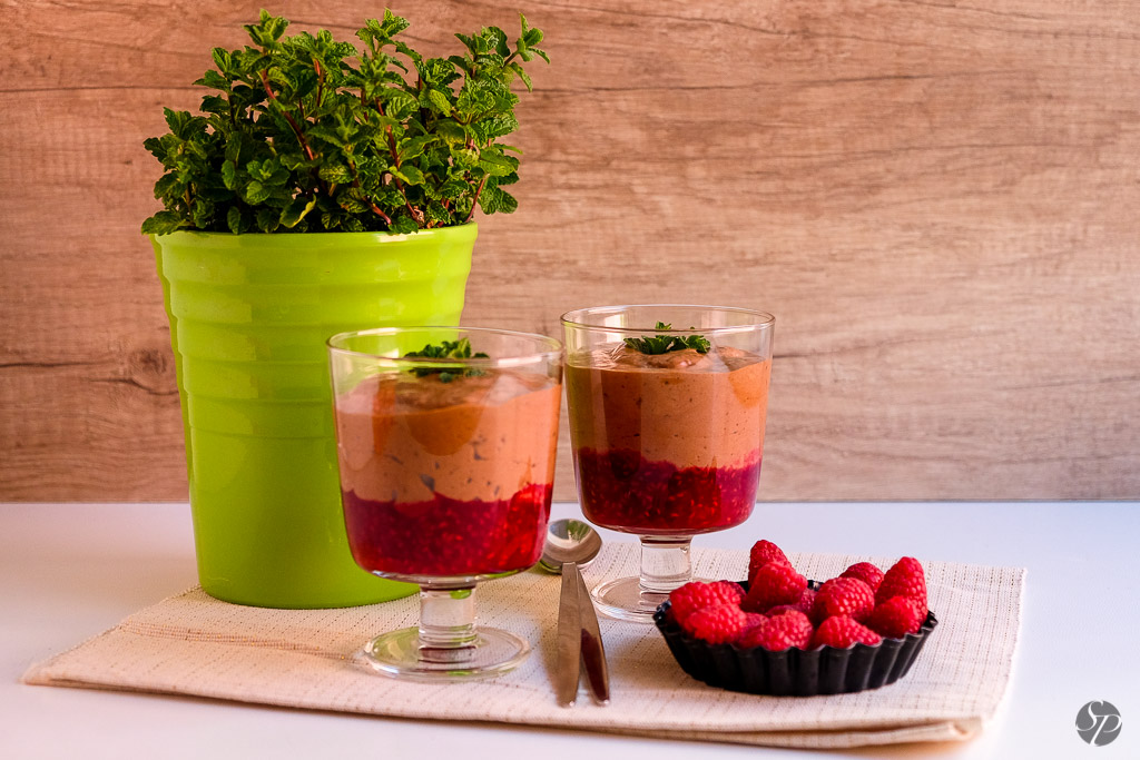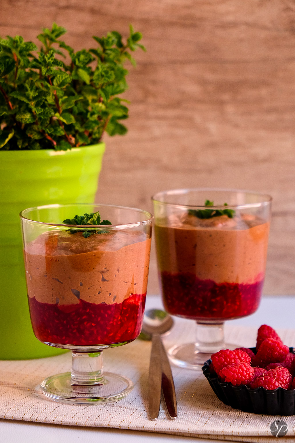 V kozarčke dodamo malinin pire, ki bo dodal čokoladnemu moussu svežino. Na maline prelijemo mousse. Na začetku bo mousse precej tekoč, ampak nič skrbeti, saj se bo po parih urah v hladilniku primerno strdil. Okrasimo s svežo meto. In se že sladkamo. 😘