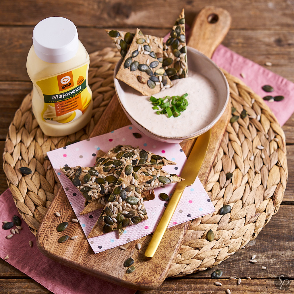 Recept je nastal v sodelovanju s podjetjem Gea – zakladnica olj. Pri pripravi namaza uporabljena GEA Majoneza, ki ima bogat harmoničen okus in je izdelana iz sončničnega olja lastne proizvodnje. V njihovi ponudbi najdete tudi majonezo, ki vsebuje manj maščob ali vegansko majonezo.