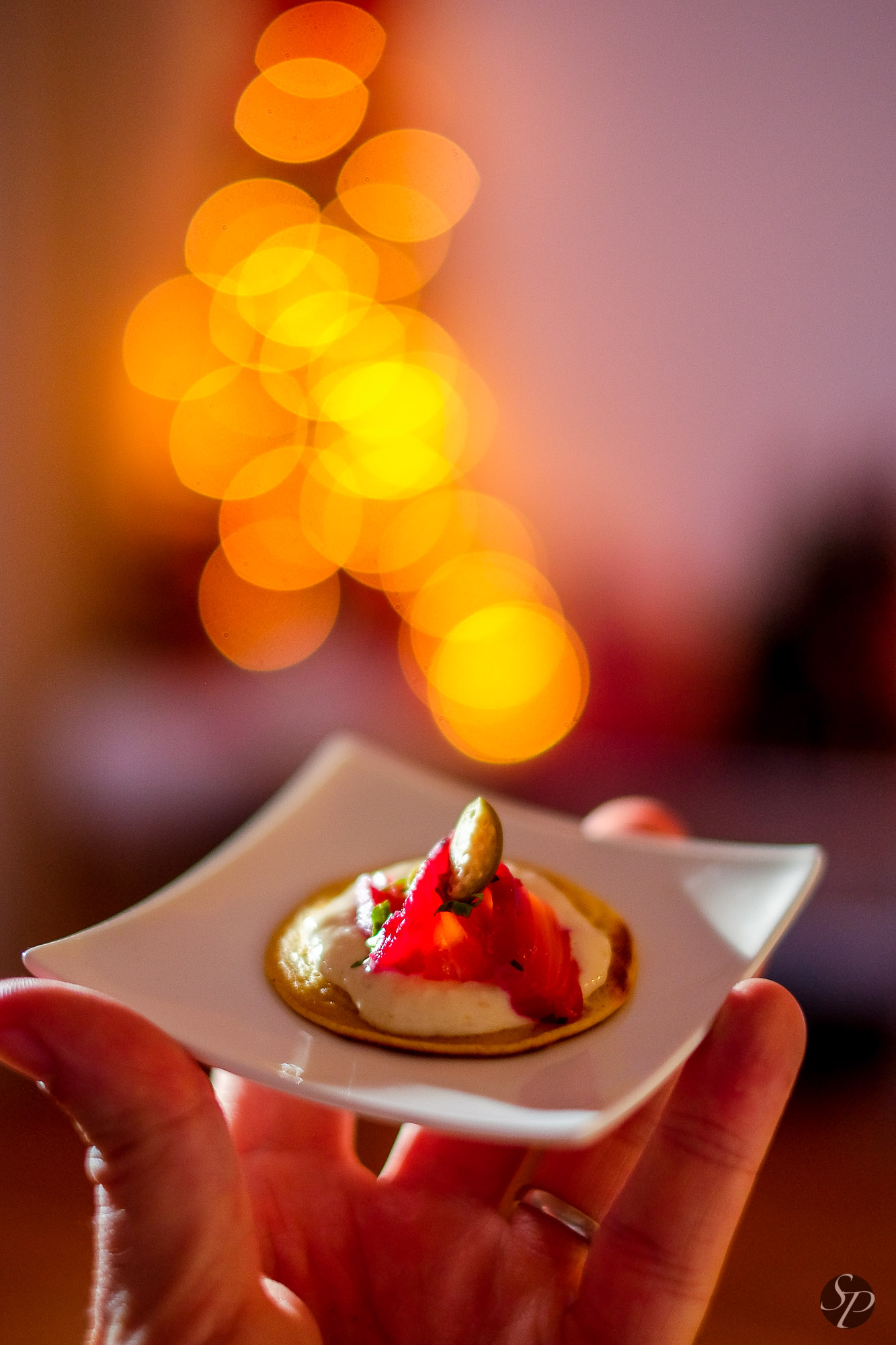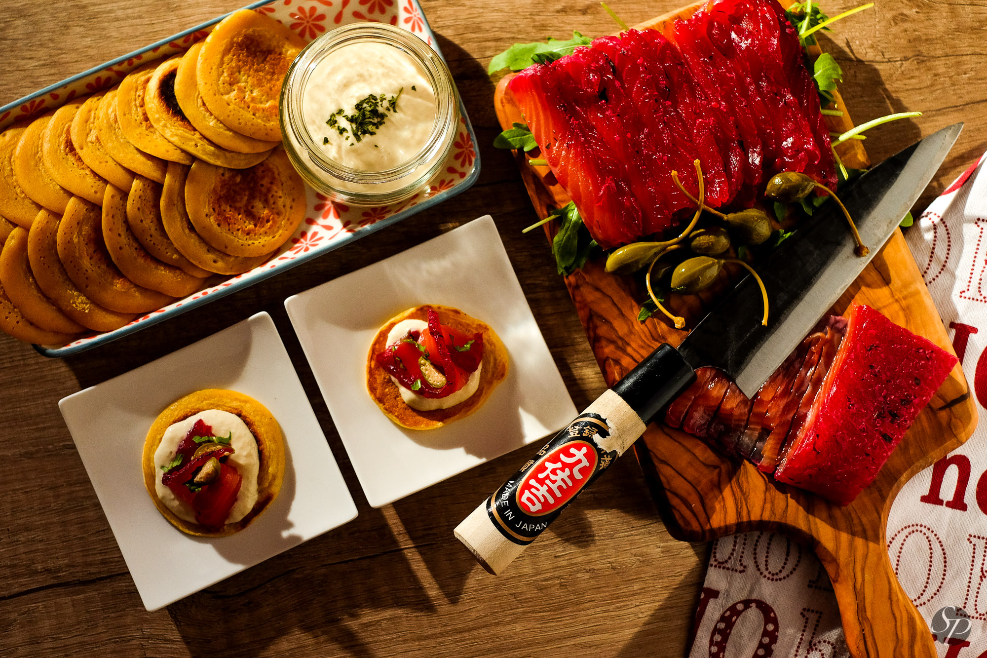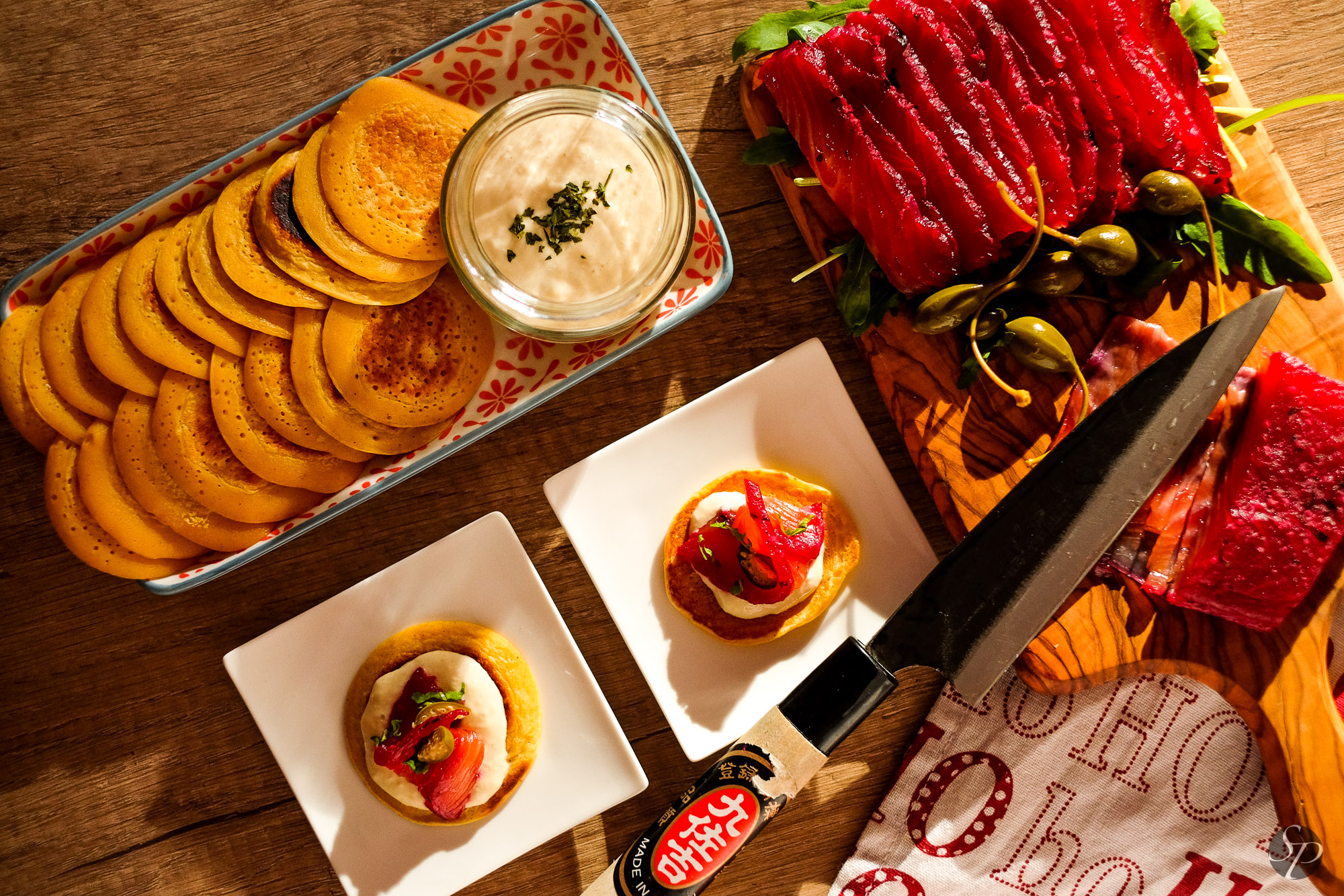 Mariniran losos lahko postrežete brez kakšnih dodatkov, na odeji iz rukole. Lahko pa spečete mini palačinke (masa popolnoma enaka kot za palačinke, le da ji je mož dodal malce pecilnega praška, dimljene rdeče paprike in soli).