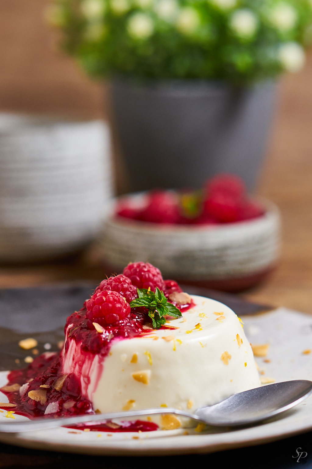 Okrasimo z malininim pirejem, svežimi malinami, limonino lupinico in kokosovimi kosmiči.