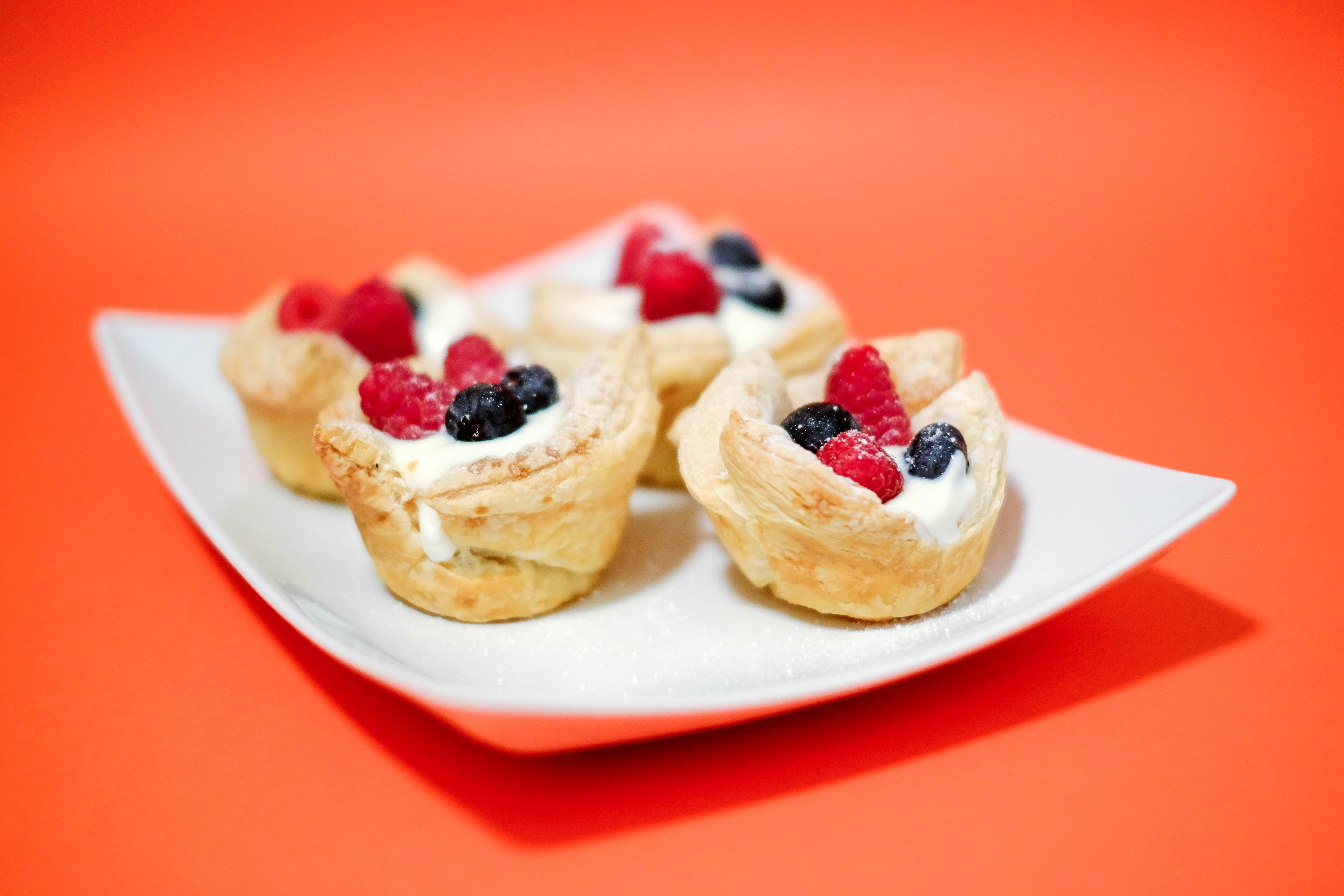 Nadev košaric lahko prilagodite vašemu okusu in željam. Meni sta najljubša nadeva ali maskarpone ali grški jogurt ter vanilijeva krema. Recept lahko vzamete iz objave: https://sladke-petke.si/samrole-mille-feuille-z-vanilijevo-kremo/.