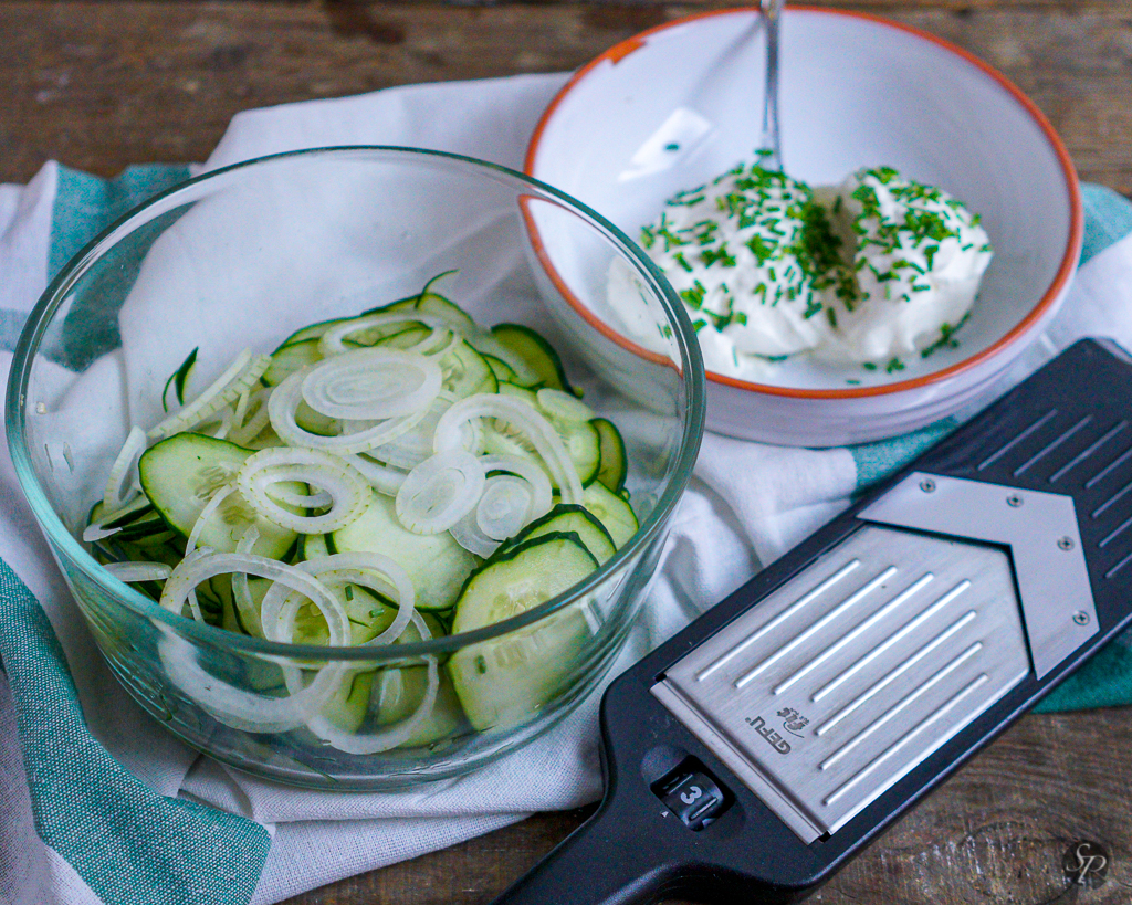 Lahka in osvežilna solata iz domačih kumaric (mi na Štajerskem jim rečemo murke😀) z lahkim in kremnim dresingom iz kisle smetane in drobnjaka.