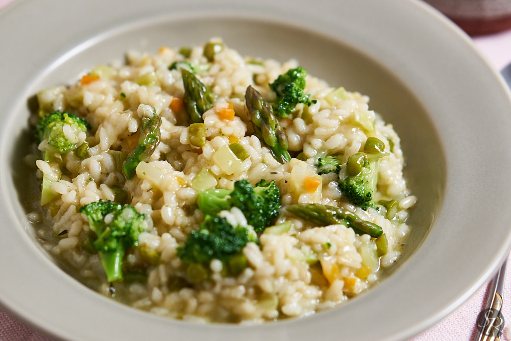 Na olivnem olju prepražimo na drobno narezano čebulo, korenček in zeleno. Ko se zelenjava zmehča dodamo steblo brokolija in špargljev. Začinimo s soljo, poprom in suhim timijanom. Pražimo par minut. V posodo nato stresemo riž in povečamo temperaturo. Riž se bo začel pražiti, zato je potrebno, da ga nenehno mešamo. Po približno minuti, dve, dodamo še jušno kocko, dolijemo dve do tri zajemalke vode, v kateri smo blanširali brokoli in zmanjšamo temperaturo.