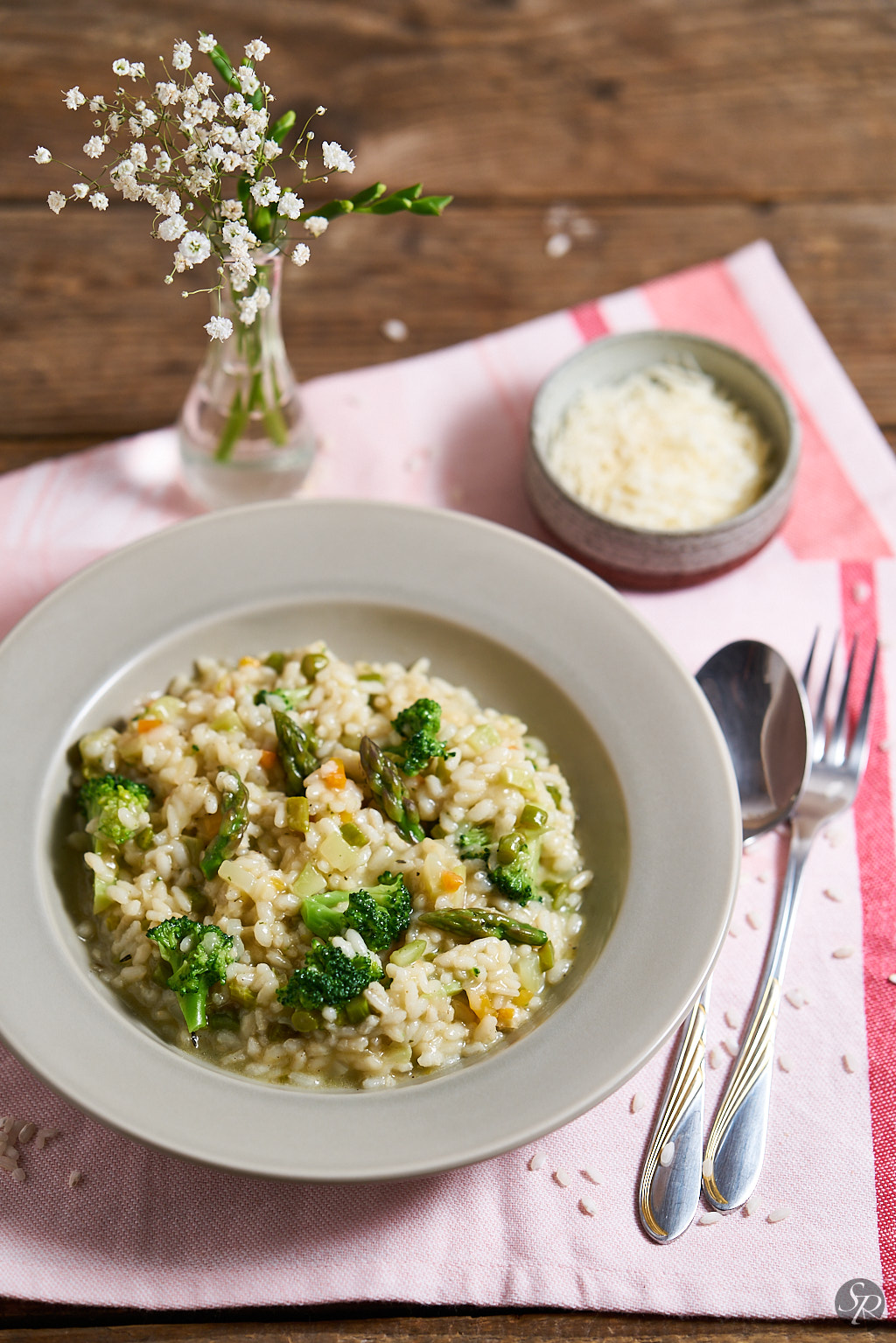 Pri nizki temperaturi kuhamo rižoto cca. 20-25min, kateri postopoma dodajamo tekočino IN POMEMBNO nenehno mešamo, da sprostimo čim več škroba. Pet minut pred koncem vmešamo cvetove brokolija in vršičke špargljev ter dodamo košček masla. Preverimo ali je dovolj začinjeno. Okus pomladne rižote je zelo blag in nežen, zato po rižoti nisem naribala parmezana. Ni pa prepovedano. 🙂