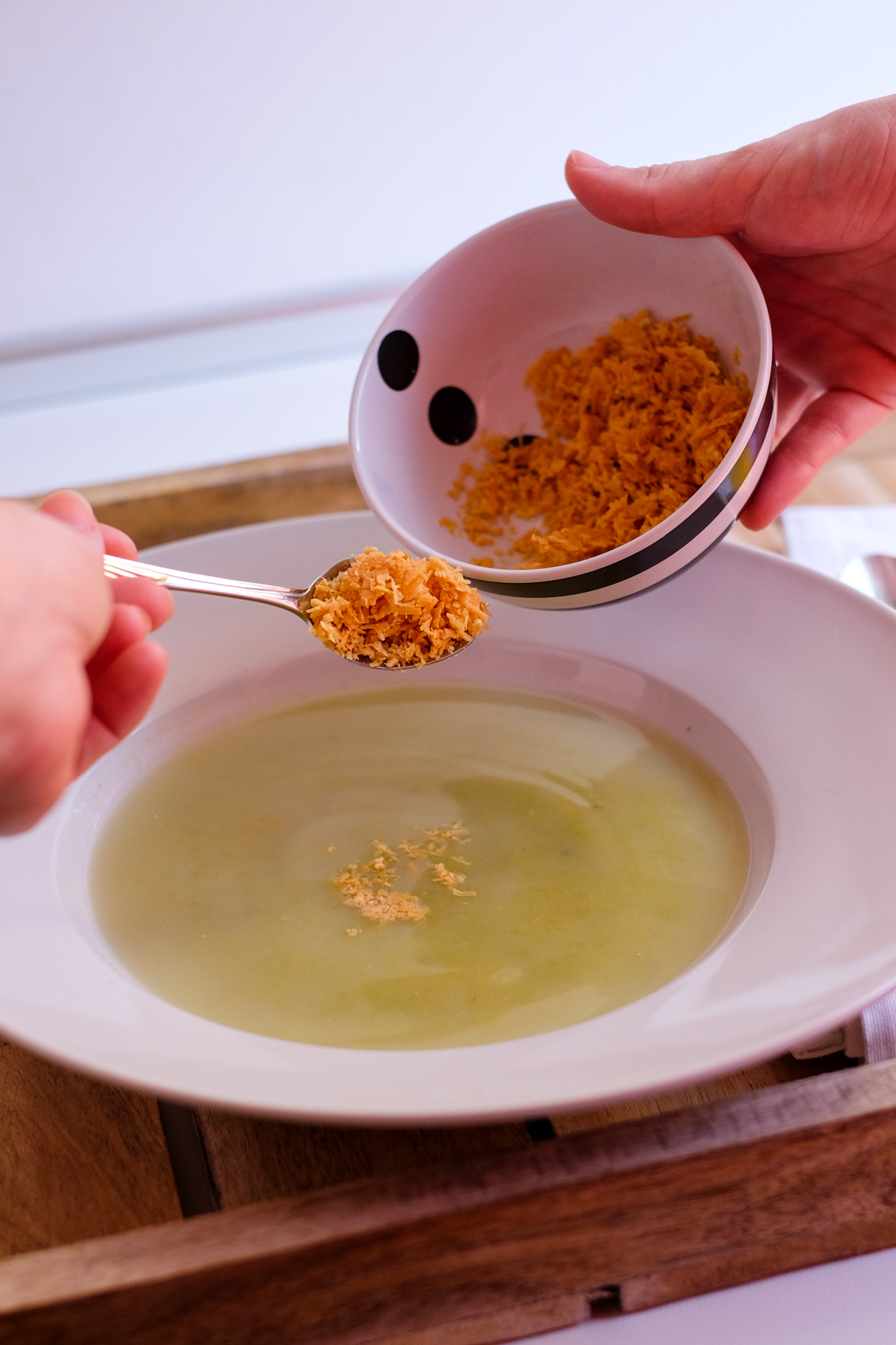 Obožujem bučno juho. Kako jo pripravim najdete tukaj, vendar se pri pripravi juhic nikoli ne omejim in poskušam pripraviti vedno kakšno novo. Nisem pa še ugotovila, katera je moja najljubša juha. 🙂 Kolebam med grahovo ter bučno. 🙂 Me je očarala tudi gospa Por. 🙂