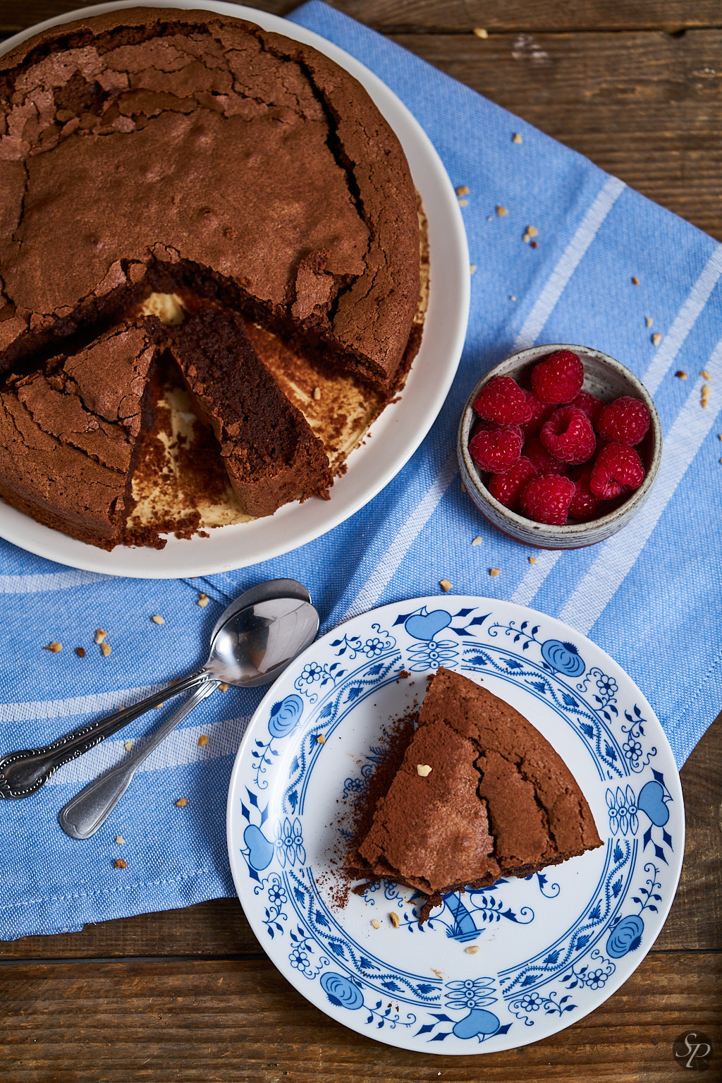 Beljake in drugo polovico sladkorja stepemo v čvrst sneg. Z lopatico jim počasi vmešamo v čokoladno zmes. Zmes prelijemo v namaščen pekač in poravnamo vrh tortice. Položimo v segreto pečico in pečemo 30 minut. Tortico položimo na rešetko in počakamo deset minut, nato odstranimo tortni obroč. Počakamo, da se tortica ohladi. Pred postrežbo potresemo s kakavom in po želji postrežemo s kepico sladoleda ali stepene smetane.