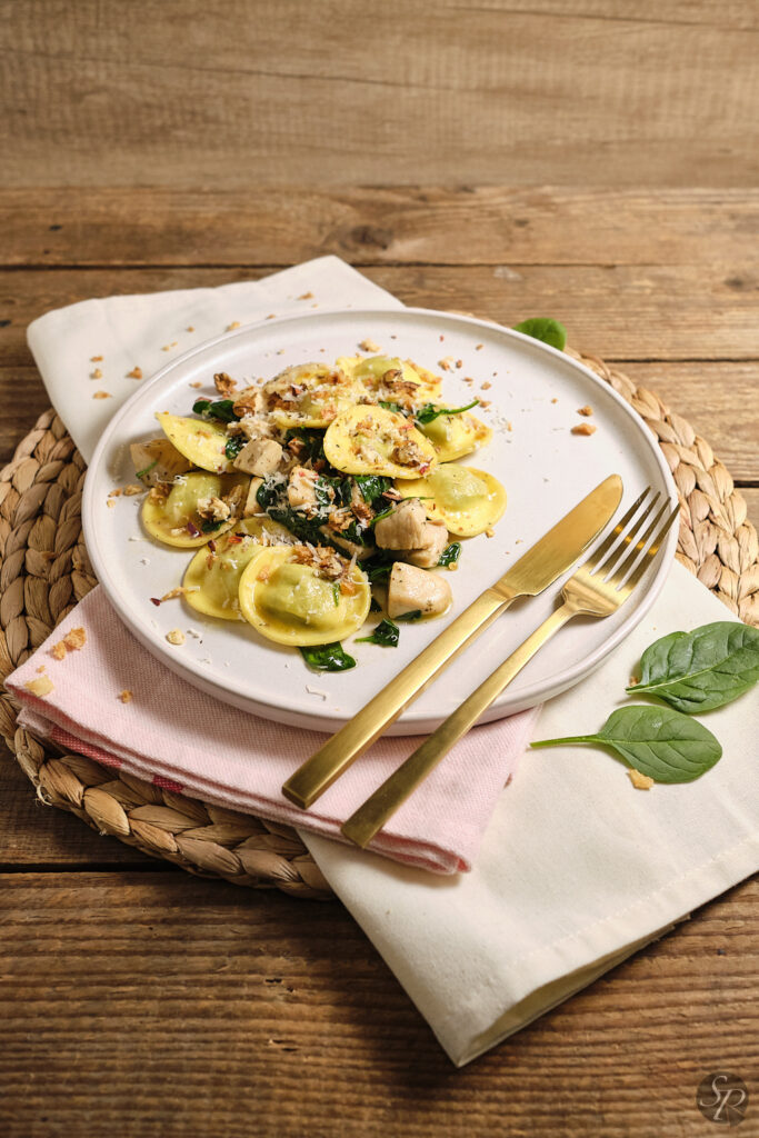 Ravioli s špinačo in rikoto odeti v oreščkasto masleno omako, kateri je dodan popečen piščanec in sveža špinača. Če je le priložnost, dodajmo svoji hrani še esktra svežo zeleno zelenjavo. Tako, da se špinača skriva v raviolih in tudi v naši omaki.