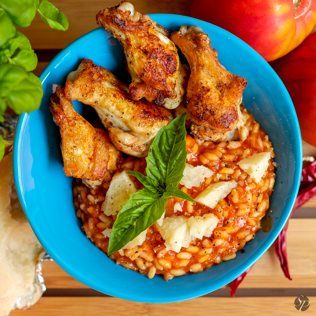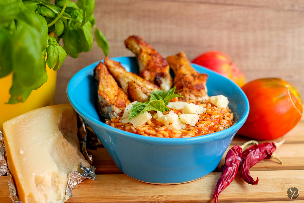 Preveč paradižnika? Domača paradižnikova omaka ni samo za pice in testenine… lahko postane tudi del odlične rižote. Tokrat sva čistila hladilnik in porabila kar nekaj sestavin, ki bi sicer romale v smeti – tega pa ne želimo, kajne? Tako je iz starega korenčka, čebule, ostanka kokošje jušne osnove, odprte paradižnikove omake in nekaj ostalih sestavin (predvsem riža), nastala super rdeča rižotka.