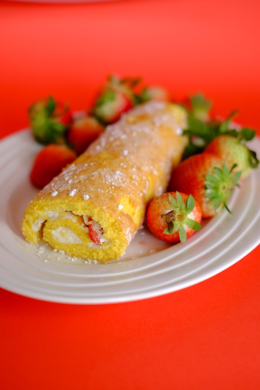 Medtem, ko se rolada peče si pripravimo na delovni površini peki papir, ki je potresen s sladkorjem v prahu (da se nam vroča rolada ne prilepi). Pekač s pečeno rolado obrnemo na pripravljen peki papir. Papir na katerem se je pekel pazljivo odstranimo, da ne poškodujemo rolade. S peki papirjem si pomagamo, da rolado zvijemo (upam, da vam ni počila). Odvijemo, ohladimo in namažemo z nam najljubšim nadevom. Eno sem namazala s spodnjim nadevom – verjetno sem omenila, da so jagode moj najljubši sadež. 🙂 Drugo rolado sem namazala z domačo slivovo marmelado.