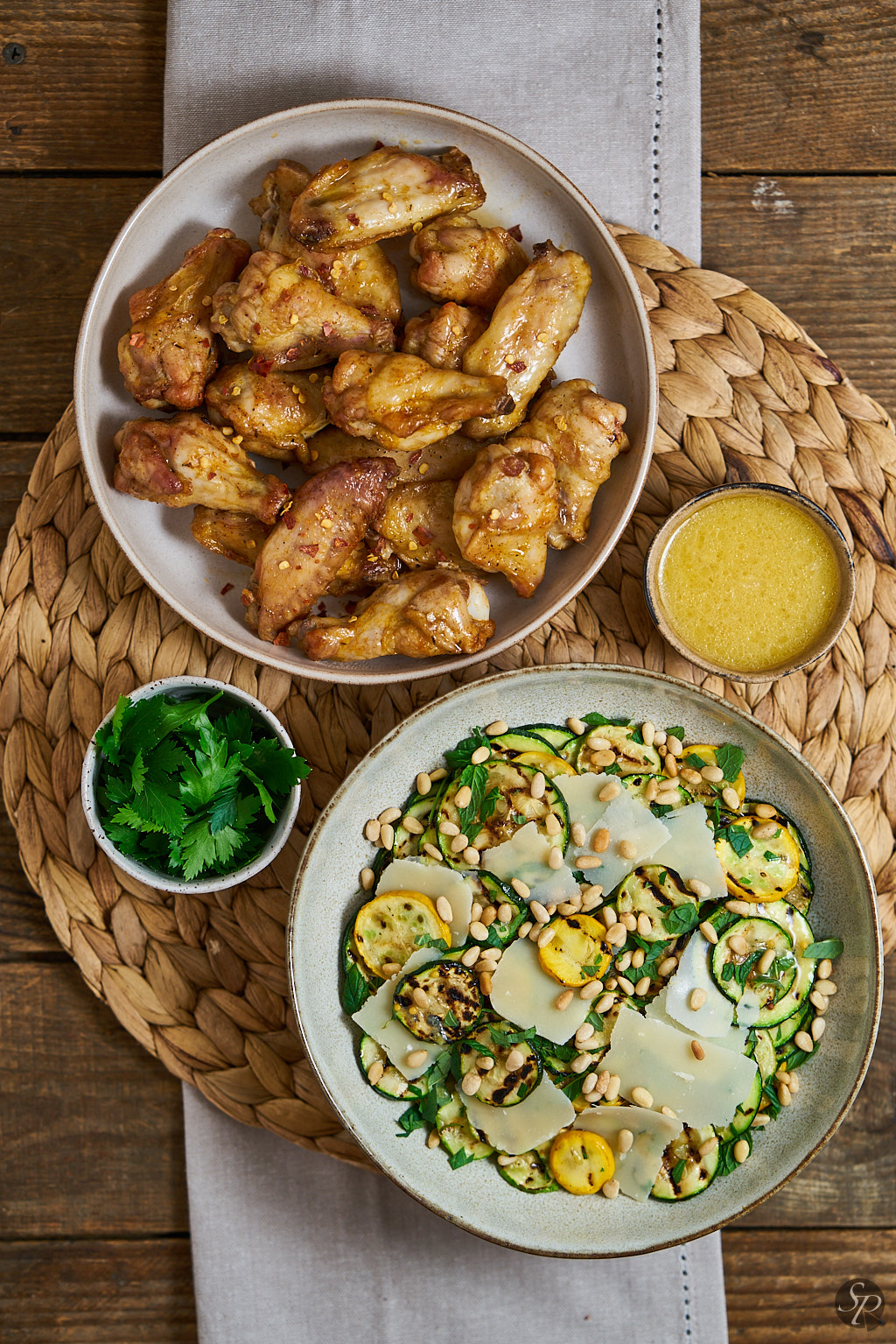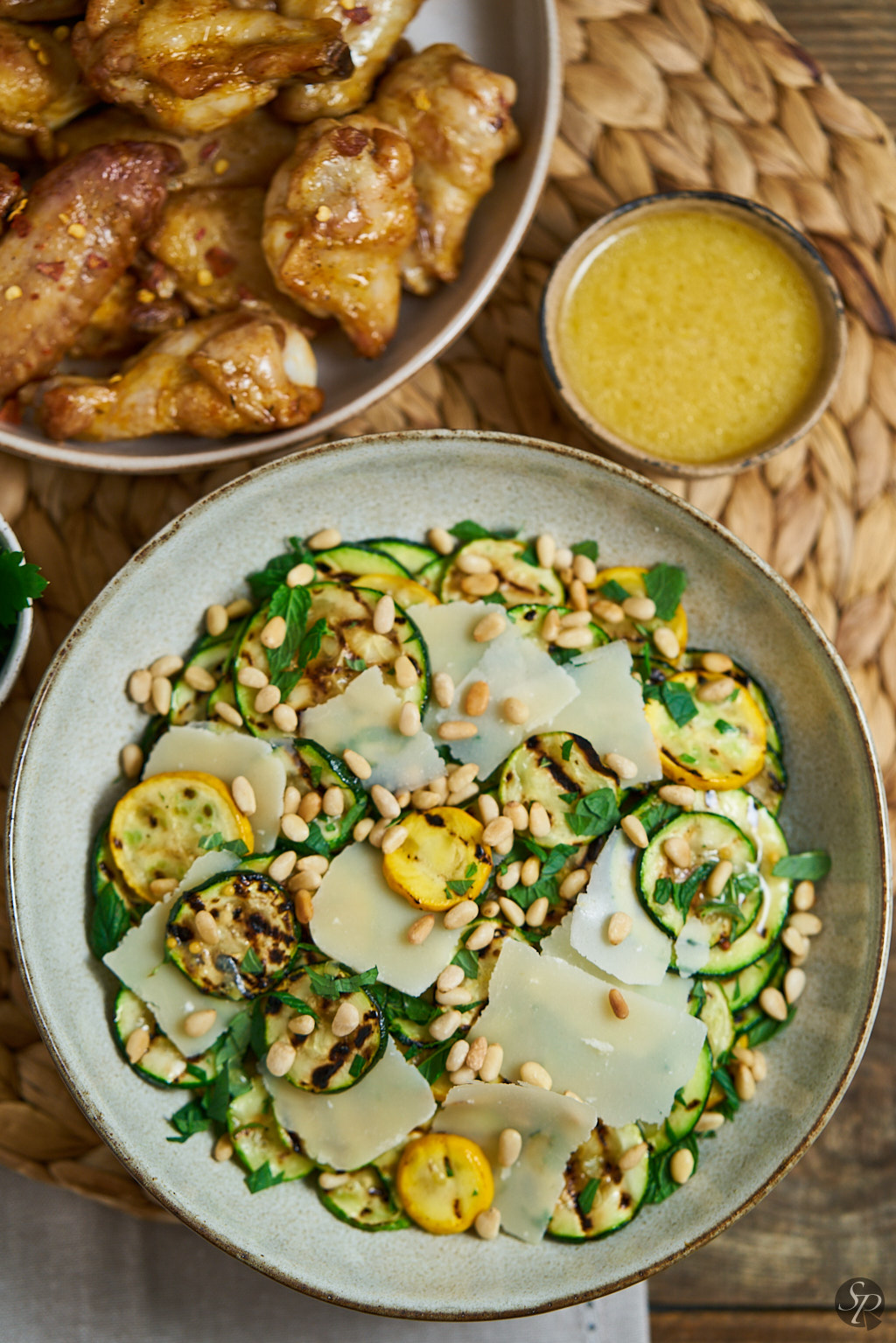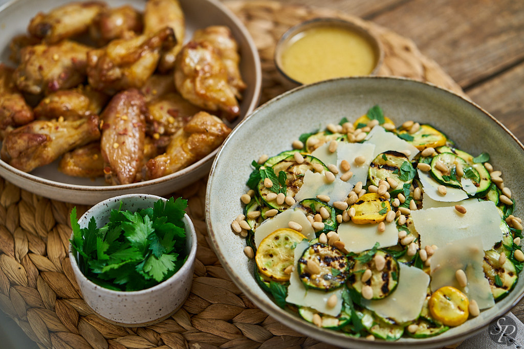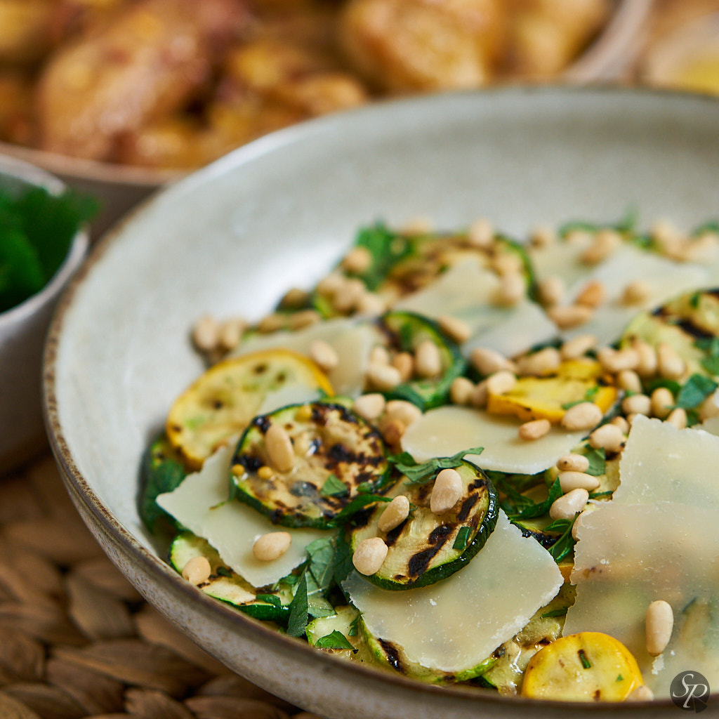 Vsi smo komaj čakali, da bo na domačih vrtovih dozorela zelenjava. Na našem vrtu je vsako leto preveč bučk, zato jih poskušam pripraviti na različne načine, dodati v različne jedi. Največkrat in najraje jih spečem v pečici kot prilogo ali dodam v omako za testenine. Tokrat sem poskusila nekaj novega in iz njih pripravila toplo solato z dodatkom parmezana in pinjol. Dresing za solato iz limone in gorčice je dodal piko na i.