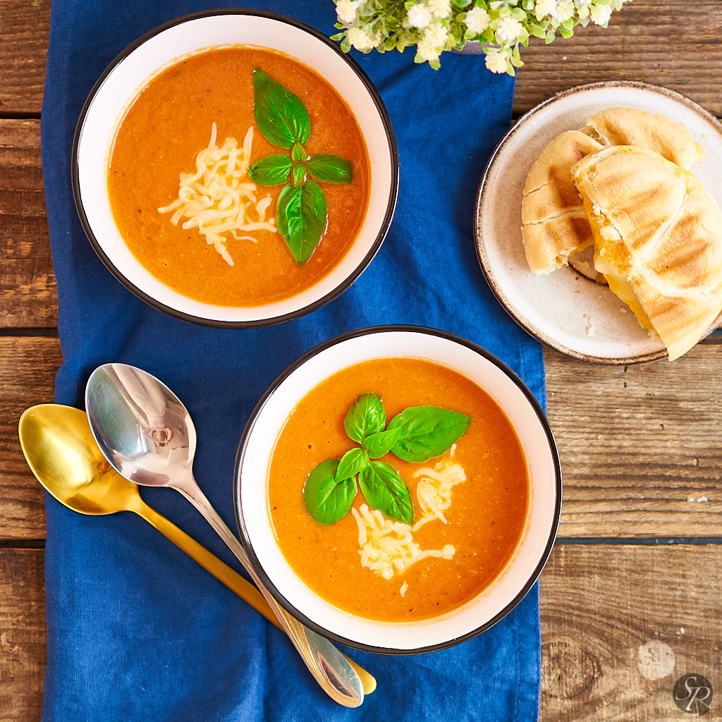 Domača juha s pečenimi paradižniki, česnom, čilijevimi kosmiči, olivnim oljem in karamelizirano čebulo. Odličen, okusen in eden najboljših načinov za uporabo paradižnikov iz vašega vrta. Po pripravi pečenih paradižnikov nikoli ne boste želeli več juhe iz paradižnikov iz pločevinke. Sestavine za juho: 700-800g paradižnikov (priporočam polovico navadnih in polovico češnjevih paradižnikov) 1 srednje velika čebula 3 stroke česna sol, poper ščepec mletega čilija olivno olje 300ml zelenjavne jušne osnove pest parmezana 10oml sladke smetane (oz. smetane za kuhanje) za serviranje: sveža bazilika, parmezan in sendvič s sirom Postopek priprave pečenih paradižnikov: Pečico segrejemo na 200°C. Paradižnike operemo in jih razpolovimo.…
