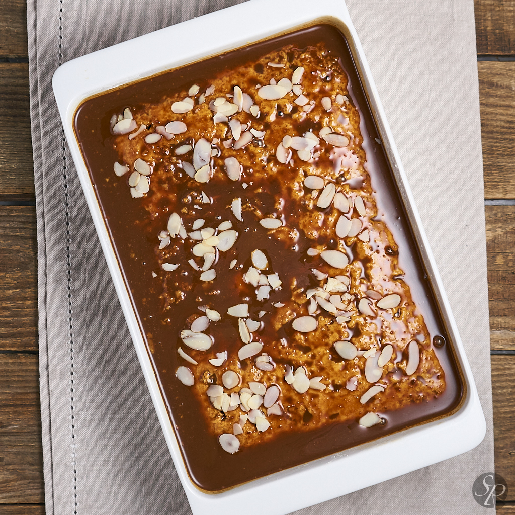 Mlečno mešanico prelijemo preko biskvita. Počakamo, da se nekoliko ohladi in shranimo za par ur v hladinik. Pred postrežbo čez biskvit premažemo preliv dulce de leche. To lahko naredimo tudi preden sladico shranimo v hladilnik, ampak bo v tem primeru biskvit vase posrkal nekaj namaza. Narežemo na kose in postrežemo s kavo ali čajem.